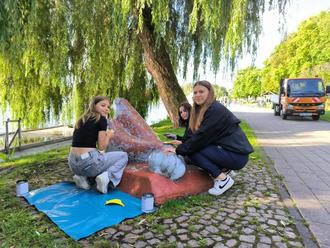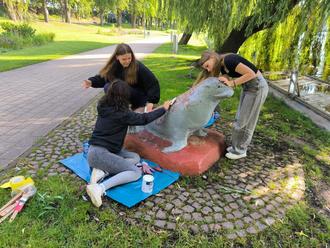 Vine Müller, Leelou Schmidt und Eva Siegmund, Schülerinnen der 8. Klasse, zauberten der Robbe ein neues Gewand
