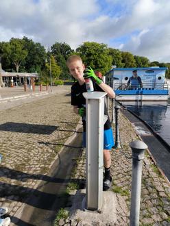 Jason ist eifrig dabei, Aufkleber an der Ladesäule am Hafen zu entfernen