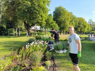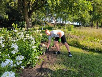 Pepe Beerwald und seinen Mitschülern Lars Sadra, Maximilian Engel und Noah Zawko (nicht im Bild) macht es sichtlich Spaß Lavendel zu pflanzen