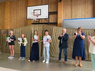 In der Klassenstufe 6 wurden Finja Rodat, Enno Schnitzer, Frieda Hoffmann, Lilly Grothe, Mara Dangschat und Magdalena Schrang geehrt – sei es für hervorragende Noten, verantwortungsvolle Aufgaben oder außergewöhnliche Leistungen wie Magdalenas Teilnahme am Bundesfinale des Vorlesewettbewerbs.