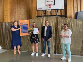Tiara Rösler der Klasse 9R1 erhielt von Mike Groß, Vertreter des Lions Clubs, einen Scheck in Höhe von 200 EUR für ihr außergewöhnliches soziales Engagement