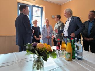 Röbels Bürgermeister Matthias Radtke, Landwirtschaftsminister Dr. Till Backhaus, Bundesminister für Landwirtschaft, Ernährung und Heimat Alois Rainer, Amtsvorsteherin Stefanie Nürnberg, Bundestagsabgeordnetem Philipp Amthor im Gespräch über das BULEplus-Projekt „Flotte Bürger" im Jugendhaus Röbel
