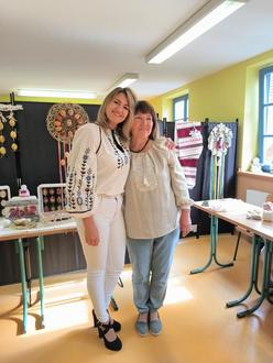 Olga und Galina freuen sich, ihre Kultur mit Bastelei zu präsentieren
