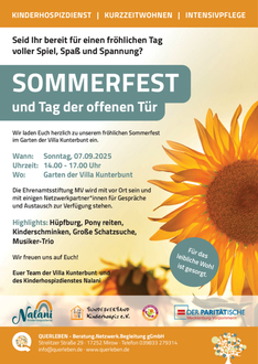 Mirow (pm). Bunte Spiele, leckeres Essen und fröhliche Begegnungen: Am 07.09.2025 ab 14:00 Uhr lädt die Villa Kunterbunt gemeinsam mit dem Kinderhospizdienst Nalani herzlich zum Sommerfest und zum Tag der offenen Tür ein. Gefeiert wird im Garten der Villa Kunterbunt, Strelitzerstr. 29 in 17252 Mirow.