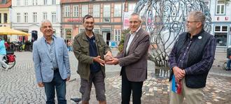 Waren (-lke). Am Mittwoch, dem 11. September, war es soweit. Sechs neue Kugeln für den Marktbrunnen als Ersatz für im Laufe der Zeit verloren gegangene, wurden an Warens Bürgermeister Norbert Möller von Museumsleiter Uwe Weiß, der dem Museum im Alten Rathaus und auch der historischen Kacheltöpferei vorsteht, übergeben. Dieses geschah auch in Erinnerung an den im Juni verstorbenen Keramikdesigner Franz Poppe. Diese Kugeln waren die letzten, die er noch zum Teil persönlich brennen konnte. Der Brunnen auf dem Neuen Markt wurde nach langem Hick-Hack kreiiert von Franz Poppe und ist ein beliebter Treffpunkt von Jung und Alt. „Mit diesen Kugeln wird das Wirken von Franz Poppe weiter gewürdigt“, betonte dann auch Norbert Möller. Immerhin erfreut der Brunnen in seiner „WWW“-Schönheit Besucher und Einheimische seit mittlerweile 21 Jahren. Stadtführer Klaus Lambrecht persönlich hat den Begriff „WWW - Waren, Wasser, Wald“ geprägt. Der Brunnen ist umgeben von restaurierten Häusern, das Wasser sprudelt und einzelne Ornamente der schmiedeeisernen Kugel symbolisieren Wald und Pflanzenwelt.