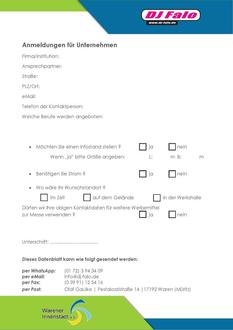 Interessierte Unternehmen, die ihre Ausbildungs- oder Praktikumsplätze vorstellen möchten, können sich noch für eine Teilnahme anmelden. Die Veranstalter freuen sich über jedes zusätzliche Angebot, das Jugendlichen Orientierung bietet und die beruflichen Möglichkeiten in der Region sichtbar macht. Anmeldung unter: per WhatsApp: (01 72) 3 94 34 09, per eMail: info@dj-falo.de, per Fax: (0 39 91) 12 54 16, per Post: Olaf Gaulke | Pestalozzistraße 14 | 17192 Waren (Müritz)