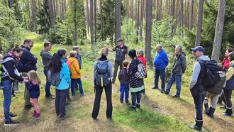 Eine dieser Einschnitte im wahrsten Sinne des Wortes war im Jahr 2010 der Sturm „Doris“. Olaf Schwahn berichtet, wie der Wald in der Nähe der „Bruchmühle“ davor aussah, und zeigt, welches Gesicht er jetzt hat. „Wir stehen genau an der Kante zu dem Gebiet, wo „Doris“ gewütet hat“, sagt er an einer der Stationen. Einige Meter weiter findet man eine Infotafel dazu und einen Gedenkstein, direkt neben dem Symbol für die Gegend, die „Ziegenberge“. Riesige Mengen Bruchholz habe man damals bergen und aus dem Wald heraustransportieren müssen. „Für die Bergung wurden vor allem Maschinen, sogenannte „Harvester“, eingesetzt, weil sie für menschliche Arbeitskräfte zu gefährlich gewesen wäre.“ Zwischen den Bäumen gibt es auch am Boden und kurz darüber viel zu entdecken: Ameisenlöwen, die Jagd auf Ameisen machen, Mistkäfer, Mäusespuren, Wildschweinlöcher und die Stellen an den Bäumen, wo der Hirsch die Rinde schmackhaft fand. Und wenn man den Blick beim Verlassen des Waldes doch einmal ganz nach oben richtet, ahnt man ihn noch: den Fischadler.