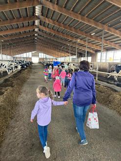 Neben diesem emotionalen Erlebnis der Kälbchen-Geburt konnten die Kinder auch die praktischen Seiten der Landwirtschaft kennenlernen. Ein weiteres Highlight war die Ankunft der Häckselwagen, die frischen Mais auf den Hof brachten. Die Kinder beobachteten, wie die großen Maschinen den Mais zur Weiterverarbeitung in die Silos transportierten.