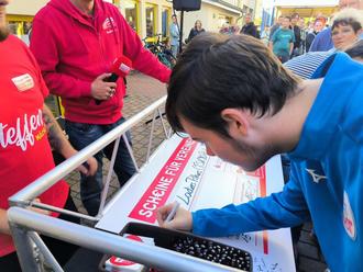 1.000 Euro waren durch das Los bereits sicher. Eine weitere Auflage lautete: Es gibt zusätzliche 1.000 Euro, wenn es dem Sportverein gelingt, am 15. September zwischen 17 und 18 Uhr mindestens 200 Menschen zur Sporthalle Röbel zu mobilisieren, um ihre Unterschrift auf dem übergroßen symbolischen Scheck zu leisten.