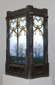 Vier romantisierende Betrachtungen zum Ende der Welt - Thomas Behling, 2024. Hinterglasdruck, Neonröhren, Glas, Holz, Gips, Acrylfarbe, Goldfolie, Radioarmatur. 113 x 72 x 49 cm. www.thomas-behling.de