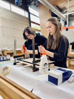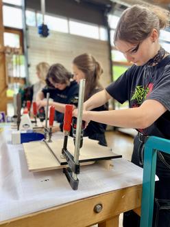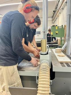 Amy, angehende Tischlerin, zeigt ihren Mitschülern die Arbeit mit dem Medium Holz