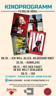 Röbel (at). Am 9. Oktober präsentiert der Filmklub Röbel erneut anspruchsvolles Kino im Engelschen Hof. Gezeigt wird "Ich will alles. Hildegard Knef. Einlass 19:00 Uhr, Beginn 19.30 Uhr. Hildegard Knef: Weltstar, Stilikone, Grand Dame des Chansons, letzte deutsche Diva, Feministin. Meinungsstark, umstritten, zugleich Spiegel und Gegenfigur ihrer Zeit. Der Film zeigt das Bild einer hochbegabten, ehrgeizigen, lakonisch-scharfsinnigen Frau, die der Welt vorführte, wie man Ruhm und Niederlagen meistert. Freuen Sie sich auf weitere Filme im Herbst.