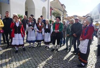 Petra Hakert bei der Begrüßung, umgeben von einigen Stadtführern in Schweriner Tracht (die in unserer Gegend üblich war)