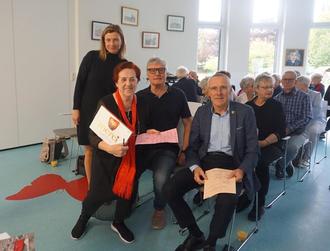 (-lke) „Es ist nicht jedermanns Sache, ein Buch zu schreiben. Aber es ist ein verflixt gutes Pflaster auf die Wunden des Lebens, wenn die schönen Erinnerungen überwiegen und in Wort und Schrift festgehalten werden“. Mit diesen Worten weisen die Warener Schreibfedern auf ihr neues Buch „Lebenswege - Geschichten aus dem Leben“ hin, das zweite bereits, das sie am 7. Oktober einem interessierten Publikum im Schmetterlingshaus im bereits 38. Literaturcafe präsentierten. Auch Warens Bürgermeister Norbert Möller war erschienen. Er würdigte die schreibenden Damen und Herren rund um Dagmar Mayer als wichtige Gemeinschaft, die einen bedeutenden Beitrag für Warens Kulturlandschaft leistet. Dafür übergaben sie ihm eine Mappe mit Wünschen, Anregungen, Vorschlägen und auch ein wenig Kritisches zu unserer wundervollen Müritzstadt. Ebenso hatten es sich Verleger Peter Schäfer und WOGEWA Geschäftsführerin Kristin Görlach nicht nehmen lassen, persönlich zu gratulieren. Während der Veranstaltung durften die Zuhörer die „Federn“, wie sie sich liebevoll selbst nennen, auf eine literarische Reise begleiten durch die Zeiten des Lebens - mit Geschichten und Gedanken, die berühren, zum Schmunzeln bringen und Erinnerungen wachrufen. Die „Federn“ bedanken sich ausdrücklich bei all jenen, die an sie geglaubt, sie ermutigt und die Entstehung dieses Buches ideell und finanziell unterstützt haben. Ohne diese alle wäre dieses Projekt nicht möglich gewesen.