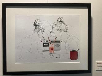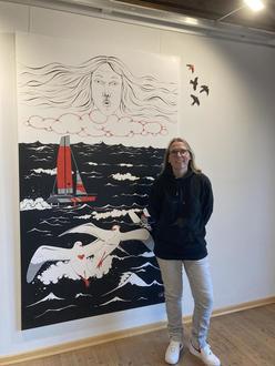 In der Ausstellung „Der rote Faden“ in der Scheune Bollewick bemerkt der Zuschauer bei genauerem Hinsehen die besonderen Feinheiten, eben die Handschrift der Künstlerin. Sei es die Silhouette der Müritz, versteckt im Hut des Fischers, der Notenschlüssel, der sich aus einer Haarsträhne entfaltet oder die Trommelsticks als Richtungsweiser der Zugvögel, die Akzente setzt Katrin ganz bewusst und diese ziehen sich wie ein roter Faden durch alle 70 Ausstellungsstücke.