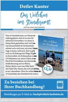 Dass ein Standesbeamter um Heiratsver- mittlung gebeten wird, ist nur eine der zahlreichen Kuriositäten, von denen in diesem Buch geschrieben wird. Und dass man ihm persönlich die Hochzeitssuite anbietet und er sich traut, mit einem blauen Auge zu trauen, wohl auch. Aber es geht auch um die Rettung einer Fliege, Regeln im Kreisverkehr, die Einflussnahme zweier US-Präsidenten auf seinen Urlaub, einen Plan B für Dreiradfahrer, eine literarische Straßenkreuzung und um Bücher, Bücher, Bücher sowie eine Stille Nacht mit Onkel Otto. Humor, das wird schnell klar, ist ein Lebenselixier. Ohne ihn verlässt keine der 33 Geschichten den Schreibtisch des Autors. Zu beziehen bei Ihrer Buchhandlung!