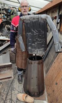 Dass Gerd Schneider diese Skulptur im fernen Sandhausen, das im Rhein-Neckar-Kreis liegt, bauen kann, ist der Vermittlung des Ehepaars Christiane und Jürgen Seiler zu verdanken. Die beiden wohnen ebenfalls in Sandhausen und machen seit über zwanzig Jahren an der Mecklenburgischen Seenplatte Urlaub. Sie interessieren sich sehr für die Thematik und trugen bereits vor Jahren mit einer Spende dazu bei, dass auf dem Gelände des ehemaligen Außenlagers eine Gedenktafel aufgestellt wurde. Jürgen Seiler erzählte dann später in seiner Heimatstadt dem Künstler Gerd Schneider von den Entwicklungen rund um das Lager in Malchow. „Ich berichtete ihm auch von dem unterirdischen Munitionswerk, wo Arbeiterinnen Sprengstoff in Hülsen abfüllen mussten. Das grünlich-giftige Nitropenta hinterließ überall Spuren auf Haut, Haaren, Kleidung... Es gelangte auch in die Atemwege“, sagt Jürgen Seiler. Gerd Schneider ging diese Schilderung nicht mehr aus dem Kopf. Aus seinen Gedanken dazu, wie man diese tödliche Zwangsarbeit veranschaulichen könnte, ging zunächst das Modell hervor. Dessen Konzept setzt der Künstler nun Stück für Stück in der Mahnung aus Metall um, die in einigen Monaten in Malchow stehen wird.