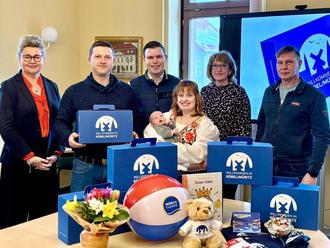 Andrea Perlick (Müritz-Sparkasse), die frischgebackenen Eltern mit Kasimir, Bürgermeister M. Radtke (mittig, Sabine Meiritz (wobau Röbel) und Daniel Berndt (Müritz-Therme) bei der Übergabe des Baby-Begrüßungspakets an Familie Fischer mit Sohn Kasimir