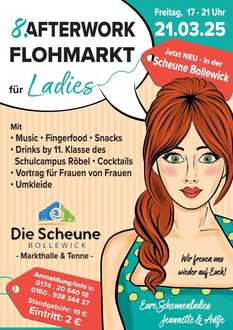 Bollewick (at). Shoppen, stöbern, genießen - und das alles in entspannter Afterwork-Atmosphäre! Am 21. März lädt die Scheune Bollewick zum Afterwork-Flohmarkt für Ladies ein. Euch erwarten 80 Stände mit Fashion, Accessoires und mehr - der Markt ist bereits ausgebucht!