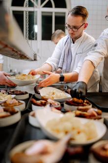 Der erste sonnige Tag des Jahres bildete den passenden Rahmen für den Auftakt: Der Empfang fand unter freiem Himmel vor dem Schloss statt - mit Feuerschalen, persönlichen Gesprächen und dem Aperitif „Green Velvet Royal“, einer eigens kreierten Grünkohl-Variation. Auch der DEHOGA-Foodtruck „Gastroburner“ sorgte für einen kommunikativen Einstieg in den Abend.
