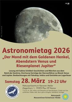 (pm). Am Samstag, dem 28.3.26, lädt der Natur- und Sternenpark Nossentiner/Schwinzer Heide zum bundesweiten Astronomietag in den Karower Meiler ein. Der Astronomietag steht mit seinem Thema „Der Mond mit dem Goldenen Henkel, Abendstern Venus und Riesenplanet Jupiter“ ganz im Zeichen unserer kosmischen Nachbarn. Der sogenannte „Goldene Henkel“ ist nur relativ selten am Mond zu sehen - an diesem Abend wird es bei gutem Wetter dazu die Gelegenheit geben. Aber auch die hellen Planeten Venus und Jupiter werden dann gut zu beobachten sein.