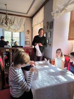 Yannis Achtenhagen, Hausherr, erklärt den Schülern das Brechen (Falten) von Servietten