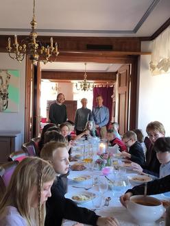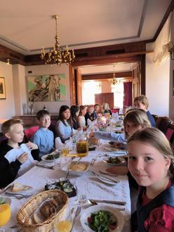 Ein stilvoll gedeckter Tisch krönte das gemeinsame Mahl. Dabei lernten die Kinder erste Regeln der Tischkultur und des Knigge, etwa wie man sich am Tisch angemessen verhält. Zum Beispiel, wo welches Besteck liegt und dass das Begrüßungsbrot mit den gereichten Dips erst gebrochen und dann bestrichen wird. „Oh, das schmeckt wie bei meiner Oma“, meinte Anni, als sie sich genüsslich den Joghurt-Zitronen-Dip auf das frische Brot strich. Wer wem nun das Rezept verraten hat, bleibt im Verborgenen.