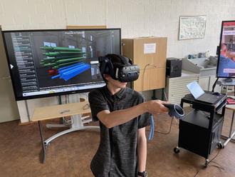 Mittels moderner VR-Technik werden den Schülern praktische Abläufe (hier die Farbwerke einer Druckmaschine) erlebbar dargestellt.
