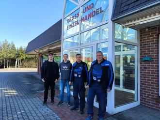 Roland Auzinger (rechts) mit Sohn Max Fendt und den neuen Auszubildenden vor dem künftigen Firmensitz in Rechlin