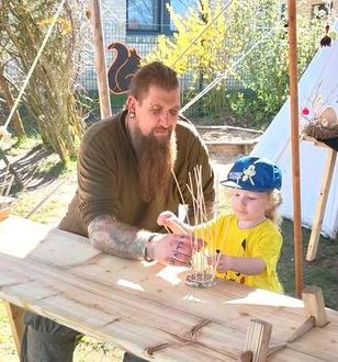 Marcel Neumann vom Slawendorf Neustrelitz zeigt dem kleinen Fridolin, wie er einen Korb flechten kann.