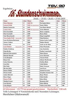 Oskar Biemann knackte mit 3600 m den Rekord von Simon Frielinghaus aus 2017. Der 8-jährige Hannes Pröhl schob die Bestmarke auf stolze 2175 m. Auch die ehemaligen und aktuellen Leistungsschwimmer legten ordentlich vor: Louisa Vetter mit 3400 m, Lennard Pröhl mit 3450 m.