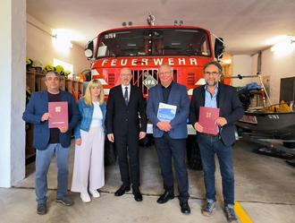 Gleich zwei Fördermittelbescheide an einem Ort für die Feuerwehren im Amt Röbel, v. l. n. r.: Steffen Höppner (Bürgermeister von Schwarz), Nadine Julitz, (Landtagsabgeordnete SPD), Christian Pegel (Minister für Inneres, Bau und Digitalisierung MV), Thomas Müller (stellvertretender Landrat CDU), Wolf-Dieter Ringguth (Bürgermeister von Rechlin)