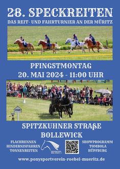 Dieses Jahr findet es zum 28. Mal statt, zumindest nach der Zeitrechnung der „Wiederbelebung“ dieser Veranstaltung. Denn die Geschichte des Speckreitens, ein Pferderennen über eine Strecke von 1.500 m, geht wohl bis in das 18. Jahrhundert zurück. Das Turnier wurde immer am Pfingstmontag ausgetragen und der Sieger erhielt eine Speckseite, die zu damaliger Zeit einen hohen Wert hatte. Eine weitere Tradition, an der bis heute festgehalten wird. Das Turnier ist offen für alle Pferde- und Ponybesitzer, auch Freizeitreiter und -fahrer sind gern gesehene Teilnehmer. Jung und Alt, Turniererfahrene und -einsteiger können in 16 Prüfungen ihr Können zeigen.