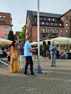 Waren (-lke) „Bitte lassen Sie die Majestät durch“, rief Moderator Leif Tennemann, als das Dampfschiff Europa am Himmelfahrttag am Warener Stadthafen vor Anker ging. Er meinte damit aber nicht Warens Bürgermeister Norbert Möller, den er eindringlich davor warnte, jetzt zu erwarten, dass seine Mitarbeiter zukünftig diese Bezeichnung benutzen. Nein. An Bord befand sich, wie jedes Jahr, die Bernsteinnixe, die sich aus ihrem Bernsteinschloss mitten in der Müritz, auf den Weg zur Müritz-Sail gemacht hatte. Wie immer an ihrer Seite ihr treuer Begleiter Fischer Olaf. Steffen Kerfers, in dessen Händen die Organisation dieses großartigen Events mit vielen Höhepunkten liegt, erwartete sie schon sehnsüchtig. Denn gemeinsam sollte die Sailflagge gehisst werden. Wer die Bernsteinnixe allerdings etwas näher anschaute, stellte fest, dass die Neu-Warenerin und begeisterte Wassersportlerin Ginette Perschall ab diesem Jahr in die Rolle schlüpft. Ganz zum Schluss gesellte sich noch Oberstabsbootsmann Daniel Lange dazu, der mit Boot und Mannschaft im Auftrag der Marine ebenfalls im Stadthafen vor Anker lag und sein Boot für Besichtigungen und repräsentative Fahrten bereithielt. Neben dem Warener Bürgermeister hatten sich auch Röbels Bürgermeister Matthias Radtke, Röbel ist neben Waren und Rechlin ein weiterer Veranstaltungsort, der Bundestagsabgeordnete Johannes Arlt und Sabrina Repp, die für die SPD für das Europa-Parlament kandidiert, zur Eröffnung der Müritz-Sail eingefunden. Dazu hatte Petrus die Sonne blank geputzt, sodass auch die zahlreichen Schaulustigen und die Gäste der umliegenden Restaurants eine schöne Zeit verbringen konnten.