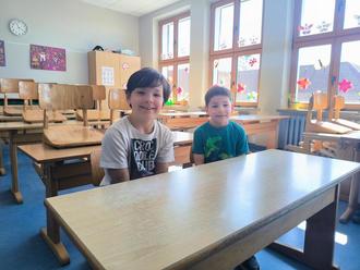 Emilian (9 Jahre) und sein Bruder Valentin (6 Jahre) sitzen Probe