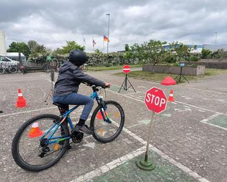 Im Verkehrsgarten ist eine Miniaturausführung eines Straßenbildes auf die Steine gezeichnet, Verkehrsschilder säumen die Wege – ideale Bedingungen, um reale Verkehrssituationen gefahrlos zu üben. Die 4. Klasse der Grundschule Röbel ist mit 25 Kindern und eigenen Fahrrädern gekommen. Im Rahmen des Sachunterrichts absolvieren sie ihre Fahrradprüfung.
