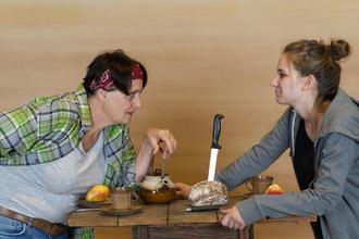 Der Roman „Alte Sorten“ von Ewald Arenz führte 2020 als Taschenbuch die Jahresbestseller-Liste des SPIEGEL an. Walter Menzlaw vom Chawwerusch Theater hat, mit freundlicher Genehmigung des Autors und des Verlags, aus dieser Geschichte die erste Bühnenfassung entwickelt und inszeniert. Im Stück begegnen sich zufällig Sally (Ann-Kathrin Kuppel), die Minderjährige, die abgehauen ist, und Liss (Felix S. Felix), die Mittfünfzigerin, die alleine einen Hof bewirtschaftet. Zunächst einen Tag und dann noch einige mehr, leben und arbeiten beide gemeinsam auf dem Bauernhof. Beim Brotbacken und dem Ernten von Kartoffeln kommen sich die zunächst eher wortkargen Frauen näher und ein dunkles Geheimnis wird langsam aufgedeckt.
