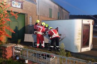 Erfde. Um 18.50 Uhr ertönten am Donnerstag die Sirenen in Bargen, Erfde, Tielen und Meggerdorf. Folgende Schadenslage war für die vier Feuerwehren abzuarbeiten: In der Kurve der Eiderstraße 13 war ein Auto mit einem angehängten Wohnwagen ins Schleudern geraten und prallte gegen ein ehemaliges Bauerngehöft. Durch die Wucht des Aufpralls war dieses in Brand geraten.