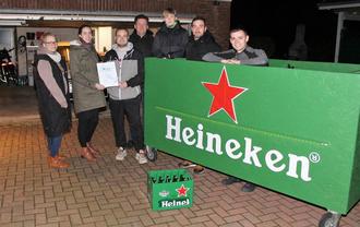Stapelholm. Mit einem Bericht und Aufruf in der Dezember Ausgabe des Stapelholmkurier hatte der Stapelholmer Heimatbund aufgerufen nach Corona das Rummelpott-Laufen wieder aufleben zu lassen. Bei einem Fotowettbewerb sollte das originellste Kostüm beziehungsweise Ensemble ermittelt werden. Nun stehen die Sieger fest. Benjamin Zimmer aus Stapel und Freundeskreis waren von dem Aufruf begeistert und schlossen sich spontan zum „Team Rummelpott“ zusammen. Ein Besuch in der Heineken Brauerei in Amsterdam, Ende November, bescherte der Gruppe die Initialzündung. Wir bauen eine überdimensionale Bierkiste und stellen als Flaschen verkleidet den lebenden Inhalt dar. Dank Internet konnten passende Kostüme in England gefunden werden. Material wurde besorgt und am 11. Dezember war Baustart. Alle neun Beteiligten waren mit Eifer dabei und bis zum Silvestertag wurde gewerkelt und gebastelt. Wie auf den Bildern zu sehen ist hat die Gruppe mit ihrer Idee und der perfekten Umsetzung einen richtigen Kracher gelandet und sich damit als eindeutiger Sieger qualifiziert. Trotz des schlechten Wetters am Silvesterabend ging die Gruppe auf Rummelpott-Tour. Mit LED Beleuchtung weithin sichtbar, wurde das “Gefährt“ wechselnd mit “Flaschen“ bestückt. Von außen halfen zur Sicherheit jeweils zwei aus der Gruppe beim Schieben und Lenken. Abgedichtet mit selbst gebastelten Plastikhauben waren Benjamin, Kirsten und Luca Zimmer, Patrick Schwaß, Wiebke Wohldmann, Chris Schultka, Ina Kolls, Svea Bromm und Florian Zimmer so von 18 Uhr bis 23:30 Uhr in Stapel unterwegs. Hinterher waren sich alle einig: „Wir hatten viel Spaß dabei und so manch tolle Resonanz auf unseren Auftritt entschädigte für das Sch…wetter!“In Stapel wurde den Gewinnern, die leider nicht alle anwesend sein konnten, jetzt ein Gutschein übergeben. Dieser wurde finanziert durch den Heimatbund und die Inhabern von Rahns Gasthof, Sönke und Sarah Thede aus Erfde. Markus Süphke