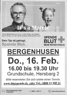 Der nächste DRK-Blutspende -Termin in Bergenhusen findet am Donnerstag den 16. Februar von 16:00 bis 19:30 Uhr in der Grundschule, Hersbarg 2 statt.