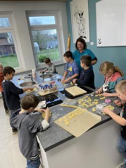 Los ging es in Stapel am Nikolaustag, um 8:30 Uhr starteten wir mit Nudelholz und Ausstechförmchen bewaffnet in der Schulküche. 32 Stapler Kinder waren bemüht Teig auszurollen und Figuren auszustechen.