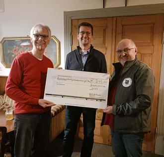 Stephan Doll (rechts) übergibt einen symbolischen Scheck an den 1. Vorsitzenden Christian Abelmann (links) und den Kassenwart Torge Nissen (rechts) des MGV Wohlde von 1861