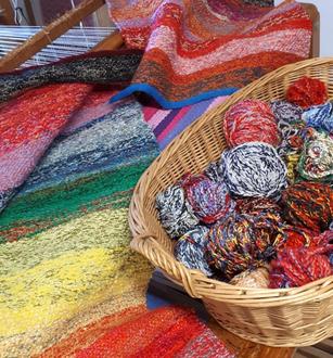 Und nach dem Fest? Wegwerfen? Nö, wir weben Teppiche daraus, ähnlich den Flickenteppichen, nur viel bunter und fröhlicher. Und durch den Plastikanteil auch stabil. Jetzt haben wir die ganze Plastikwolle aufgebraucht und wollen mehr, denn es macht viel Spaß, sich die Farbfolgen auszusuchen und den schnellen Erfolg zu sehen.