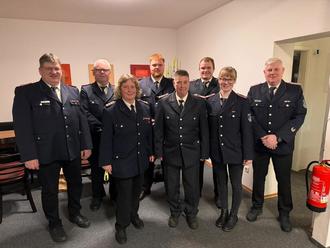 Foto von links nach rechts: Stellv. Wehrführer Matthias Koberg, Marco Ströh, Simone Gertz, Niklas Lubansky, Birgit Thoms, Patrik Hansen, Tessa Jöns und Wehrführer Heiko Brandt (Nicht anwesend: Nele Koberg)