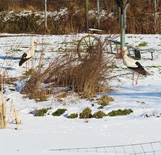 Das Gewässer (vorn) ist zugefroren - das aus dem Süden kommende Storchenpaar braucht die Hilfe der Struves