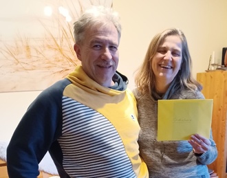 Die Überraschung und Freude standen den beiden ins Gesicht geschrieben, als Heinz Warnecke vom Vereinsvorstand den Gutschein überreichte. "Wir sind vor zwei Jahren aus dem Frankenland nach Stapelholm gezogen und haben uns hier von Anfang an willkommen gefühlt", erzählten die Müllers. "Die Bauernglocke hilft uns sehr, unsere neue Heimat noch besser kennenzulernen." Besonders schön: Jörg Müller ist inzwischen selbst Mitglied im Förderverein Landschaft Stapelholm, er interessiert sich vor allem für die Themen Sternenkiek und Baukultur.