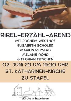 Der Erzählabend findet statt am Freitag, den 2. Juni 2023, um 19:30 Uhr, in der St. Katharinenkirche in Stapel. Der Eintritt ist frei, um eine Spende wird im Anschluss gebeten. Etwa nach der Hälfte der Veranstaltung wird es eine Pause mit Snacks und Getränken geben.