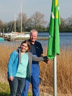 In diesem Jahr durfte Jasmin Kähler die ehrenvolle Aufgabe übernehmen, die Fahnen aufzuhängen. Insgesamt wurden vier Fahnen an der Slipanlage angebracht, die bis Oktober wehen werden.