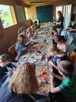 Zwei Tage zuvor ging es im Hallenanbau schon hoch her: Da wurde gepinselt, beklebt und gestempelt, was das Bastelmaterial hergab. Einige Eier haben das kreative Chaos leider nicht ganz heil überstanden.