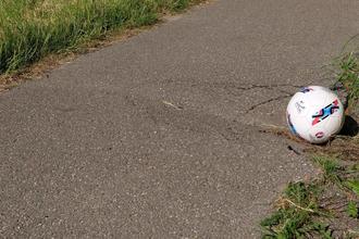 Mit Hilfe des Fußballes (22 cm Durchmesser) erkennt man die Gefahren der Bodenrillen.